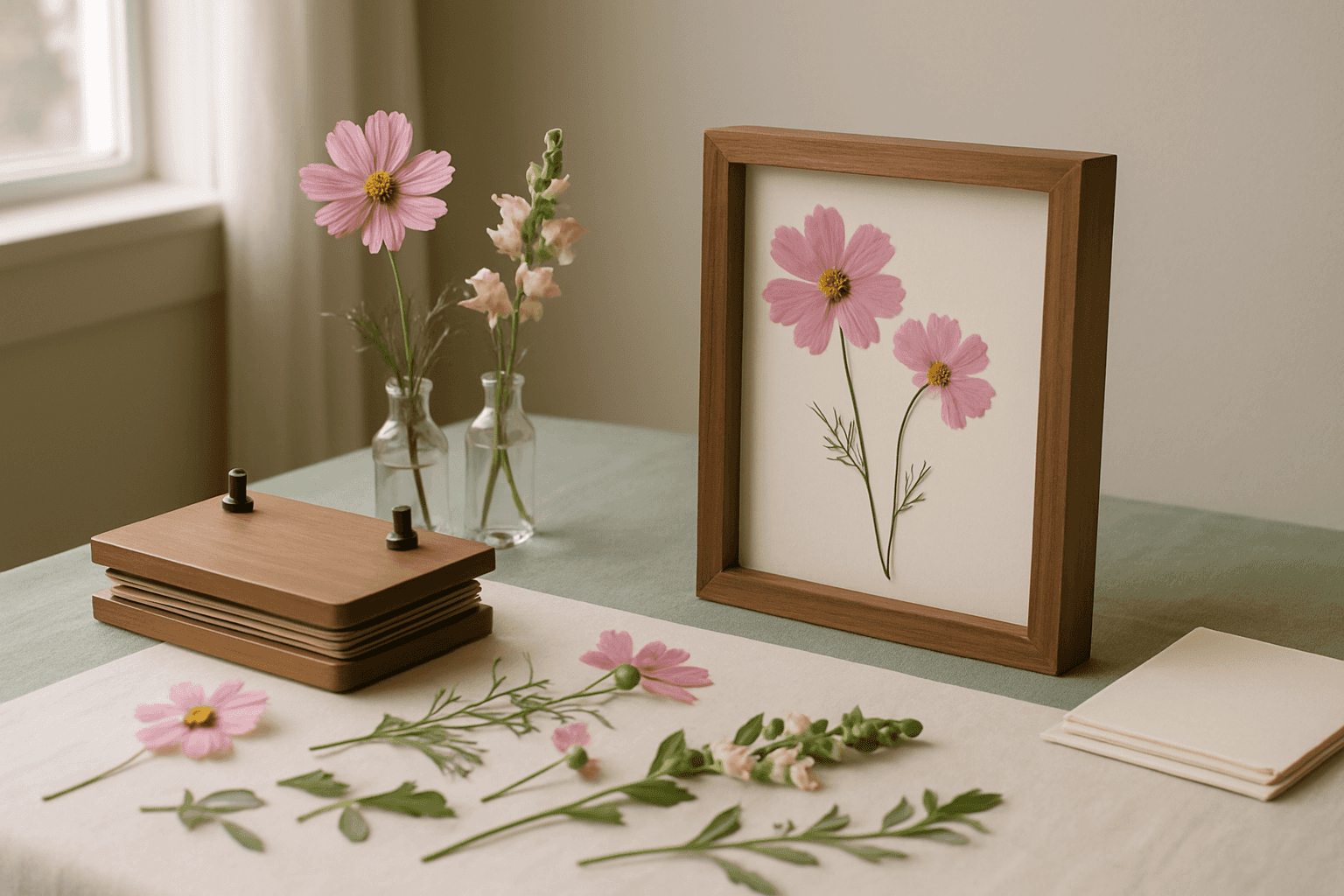 At our pressed flower workshop in Beverly, MA, expect a 15-minute opening demo on composition, then roughly 90 minutes of open working time with trays of seasonal flora and a frame of your choice. The instructor circulates for help; wine or mocktails run between steps. Total on-site time is about two hours, and every guest leaves with a finished, wall-ready frame packaged for the drive home.